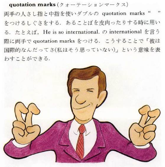 ” air quote ”  のジェスチャーにより、 なおさら強調する。